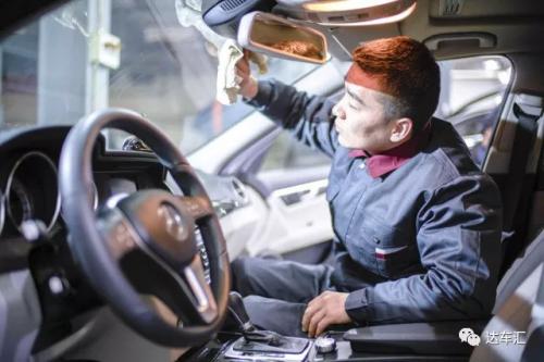 达车汇的同事们从市面的上百种产品中,反复试验对比,最终得出的结论是,只有使用中性添加剂成分,才可以在不损伤风挡膜和玻璃本身的前提下,通过内部的有机硅和氟碳活性成分,在风挡表面形成一层接近纳米级别的亲水层,改变其表面的张力,使得水和玻璃的浸润角达到最大,从而呈现均匀透明的状态,并可以保持较长时间。