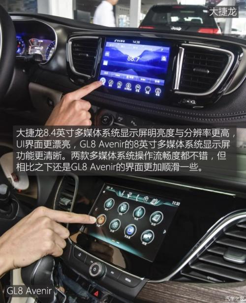 多媒体系统方面,GL8 Avenir配备的是一块8英寸显示屏,大捷龙则是8.4英寸,相差不大。清晰度与操作流畅度两者都做的不错。有一点值得注意,GL8 Avenir的多媒体系统支持CarPlay功能,但大捷龙不支持,只能匹配克莱斯勒专用App,这一点上不够与时俱进。