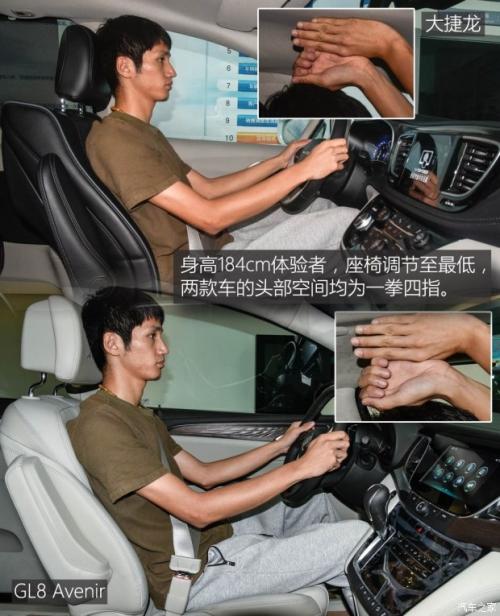 针对第二排与第三排的空间比对之后,我们再度看到两款车风格的不同。GL8 Avenir依旧在空间上更加照顾第二排乘客,座椅前后调节范围更大。但大捷龙的风格就不同,整体空间分配更加均匀,保证三排座椅任何情况下均可同时坐人。而论空间的直接对比,体验者将第二排座椅调节至两拳空间时,大捷龙的空间表现稍好一些,这主要由于大捷龙第二排座椅座垫较薄,对于空间的贡献更大。