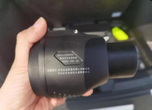 【快充说明】在这里需要表扬下比亚迪工程师真“聪明”,设计一款直流转交流的适配器,标签“直流1000V 45A”,最大支持45KW产品。把这个直转交适配器插到慢充接口上,与秦dmi的快充同理,实际直流充电功率不超过18KW。