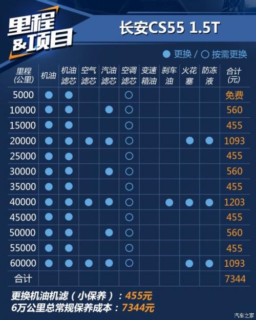 在6万公里的常规里程内,长安CS551.5T的保养成本为7344元,比荣威RX5贵了2243元,这是由于荣威RX5的保养周期为7500公里/次,作为同样使用了全合成机油的长安CS55来说,5000公里/次的保养周期确实稍显频繁了一些;长安CS55的保养成本较传祺GS41.5T贵了约500元,这与长安CS55日常维护时使用的是全合成机油,传祺GS4为半合成机油有一定的关系,机油品质上前者稍占优势。