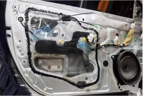 打开汽车的门板饰盖以后,可以看到原车门板内部仅有一层简单的塑料薄膜,很难起到良好的隔音效果,这导致门板处共振噪声十分明显。对此,技师使用银鲨减震胶,对门板做双层止振处理,将门板包裹严密。有效地抑制了门板的共振,也阻止风噪噪音的传入。