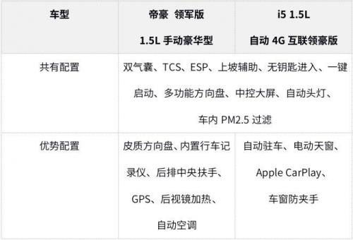 也正是有了这万元的现金优惠,荣威i5在配置方面才更能凸显它的性价比。我们拿荣威i5和国产轿车销量冠军帝豪来做比较,对比车型为帝豪领军版1.5L手动豪华型(7.48万)和i5 1.5L自动4G互联领豪版(抢鲜价7.49万)。