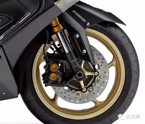 雅马哈Tmax 530可配置ABS,前制动采用267mm双刹碟盘径向四活塞卡钳的设定,刹车拉杆可更换为可调式的设计,后制动为282mm碟盘单活塞卡钳。倒置式的前叉不仅美观而且可以提供强大的稳定性。