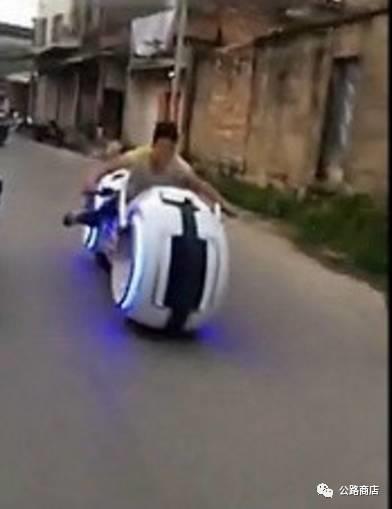 一青少年骑着科幻电影《创战纪》中的摩托车“特隆”,在碣石街头试车。
