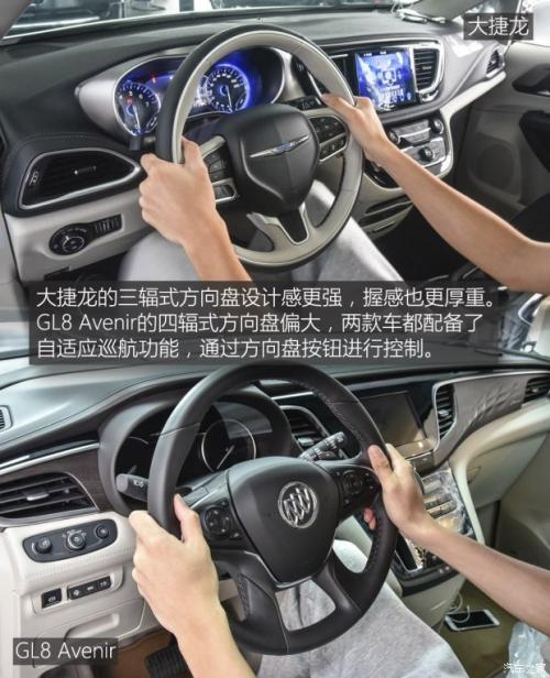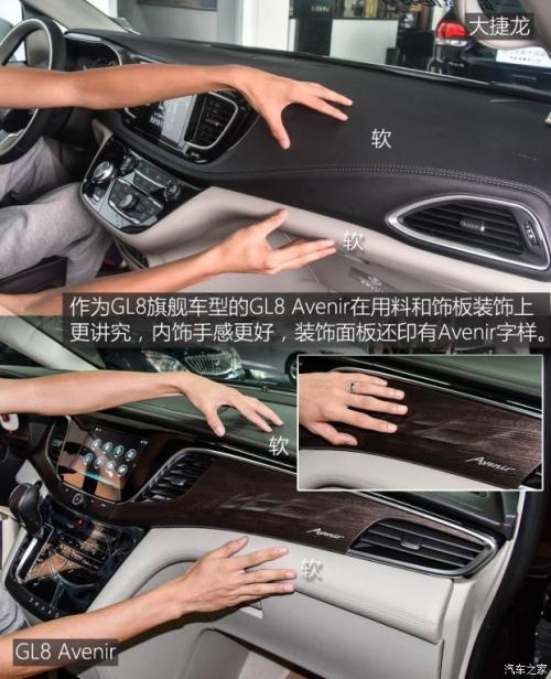 GL8 Avenir对于内饰的用料更为考究,面板摸起来手感更舒服,毕竟作为GL8车系的旗舰定制产品,还是需要有一些自己的特色的。但价位更高的大捷龙,内饰质感也代表了克莱斯勒品牌对于美系豪华的诠释,从用料质感上来说没差到哪去。