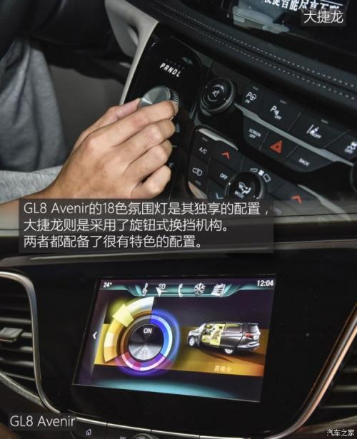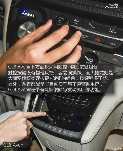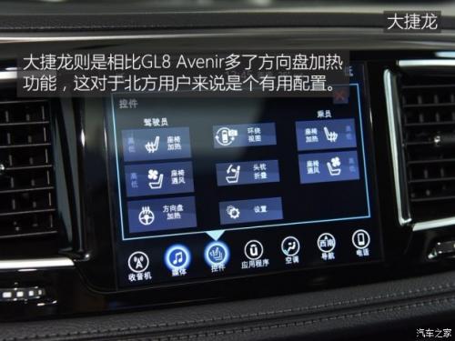 底部空调控制区域,GL8 Avenir的面板相对简洁,采用触控+物理按键设计,触控按键没有物理反馈;而大捷龙则是采用大面积的传统物理按键与旋钮组合。两者的操作位置都比较顺手,但都存在一些问题,GL8 Avenir的触控式按键很容易误操作,而大捷龙这部分功能按键略多,很容易找不到想要操作的功能键。