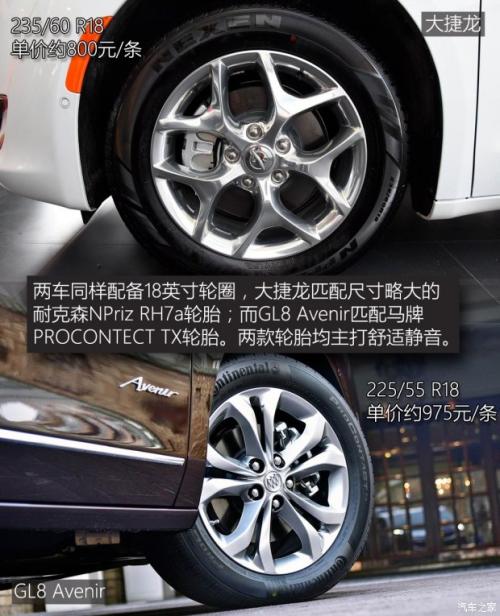 两款车同样配备的是18英寸轮圈,均是双五辐样式设计,但还是GL8 Avenir的轮圈样式看起来更耐看一些。GL8 Avenir匹配尺寸为225/55 R18的马牌PROCONTECT TX轮胎,主打舒适静音与经济节能,售价约975元/条;大捷龙则匹配尺寸略大的235/60 R18耐克森NPriz RH7a轮胎,同样主打舒适静音,目前我们无法从国内查询到这款轮胎的售价,海外官方售价约125美元(约合800元左右)。