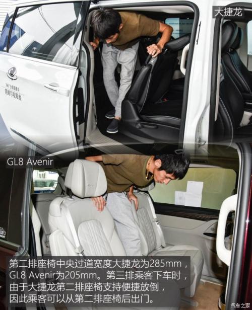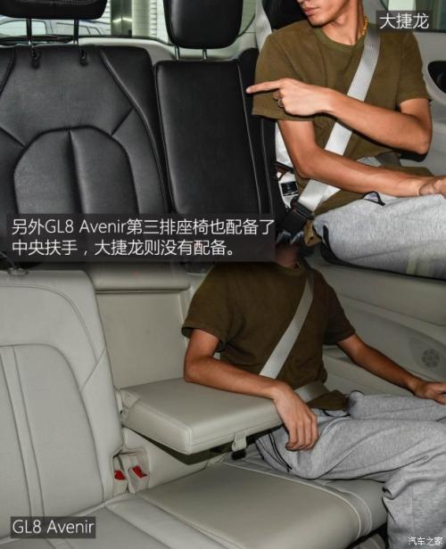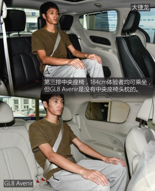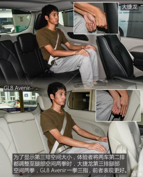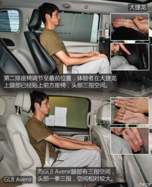 针对第二排与第三排的空间比对之后,我们再度看到两款车风格的不同。GL8 Avenir依旧在空间上更加照顾第二排乘客,座椅前后调节范围更大。但大捷龙的风格就不同,整体空间分配更加均匀,保证三排座椅任何情况下均可同时坐人。而论空间的直接对比,体验者将第二排座椅调节至两拳空间时,大捷龙的空间表现稍好一些,这主要由于大捷龙第二排座椅座垫较薄,对于空间的贡献更大。