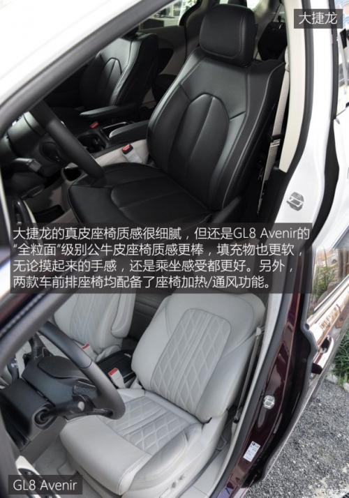 GL8 Avenir座椅材质非常出众,座椅上还带有菱格式纹理,另外在座椅填充物的运用上也很讲究,为的就是给乘客营造出更好的乘坐感受以及豪华氛围,摸起来软、坐起来更软。大捷龙则采用传统真皮材质座椅,质感也不差,虽然摸起来偏硬,但乘坐起来还是非常舒服的。除此之外,两款车前排均配备了座椅加热与座椅通风功能,但大捷龙前排座椅还带有座椅记忆功能,GL8 Avenir没有配备。因此,论前排座椅舒适度来说,GL8 Avenir更好,但前排座椅的的配置大捷龙稍高一些。