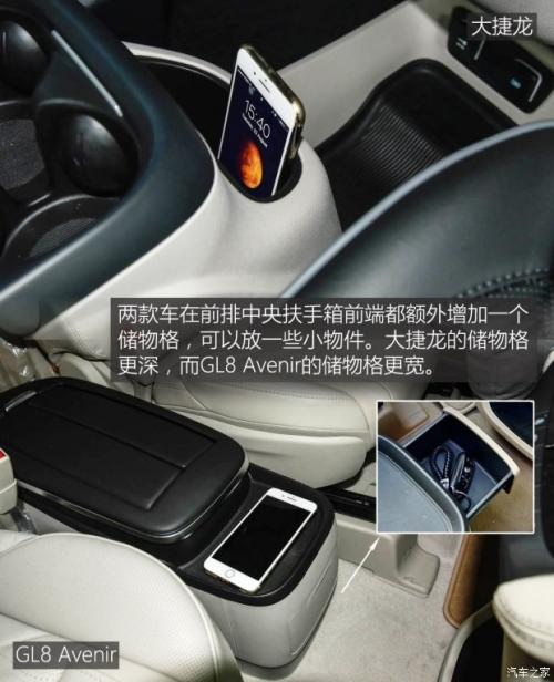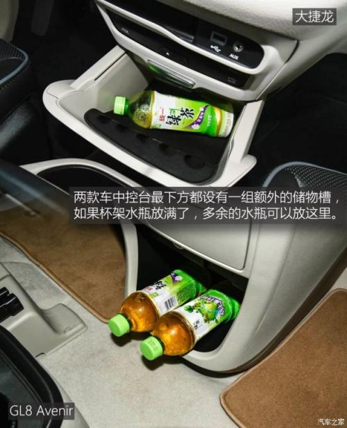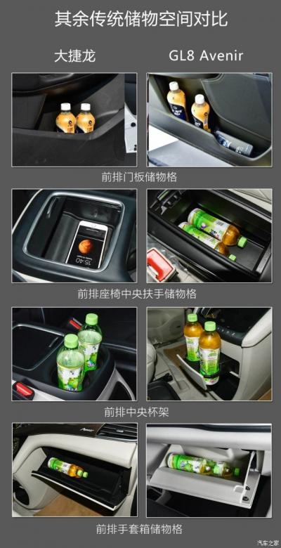 首先,第一排储物空间上,大捷龙的储物表现略占优势,这主要是由于大捷龙中控台底部的储物空间更加丰富,且前排门板上的空间利用度也很高。而GL8 Avenir则主要是在中控台顶部增加了一个收纳盒。因此前排储物空间我认为大捷龙更好。