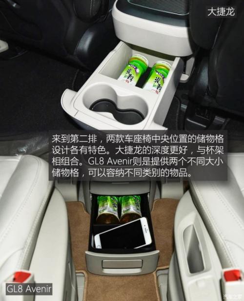 来到第二排,除了传统的储物格之外,两款车第二排储物空间的侧重点略有不同。中规版大捷龙将海外版车型上的第二排座椅收纳位置改成了收纳箱,因此储物空间一下就变得更丰富了;而GL8 Avenir则是在第二排座椅的储物能力上下了功夫,额外增加了手机存放槽,方便第二排乘客使用。所以,单纯评判第二排的储物能力的话,大捷龙还是有着不小的优势。