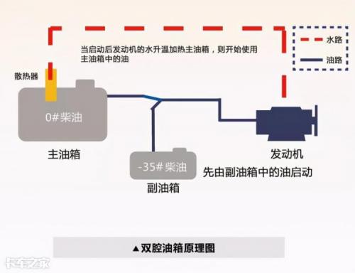 第二种是带油箱内燃油加热功能的双腔油箱,设计原理就是额外增加一组加热水管,加热水管连接主油箱中的散热器,通过发动机冷却水升温加热主油箱中的燃油,等主油箱中的燃油加热后再开始切换使用主油箱中的燃油。