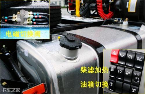 在结构上,除增加热水管外,相比普通双腔油箱,供油切换系统一般会由手动控制阀升级为电磁切换阀,同时驾驶室内会增加油箱切换开关,可以直接在驾驶舱切换供油系统,不再需要停车手动切换。