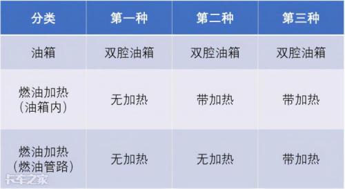 第二种既有双腔油箱、又带油箱内燃油加热功能,适合大部分寒区用户;