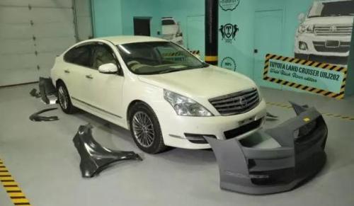 这位车主先将自己的天籁进行了整车拆卸,购买了一套GT-R的前杠、翼子板、引擎盖等一系列套件准备换装。但由于天籁与GT-R整体车架差距实在太大,所以这些组件是不能直接使用的,需要重新经过设计,在原有的基础上切割,然后重新焊接起来,工程量还是非常大,也非常细密的,容不得半点马虎。