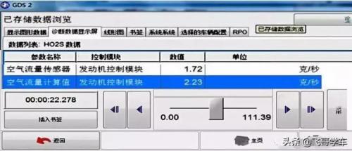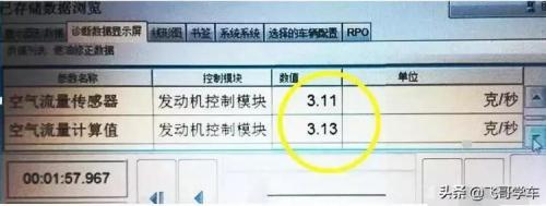 2、由于此车在其他维修厂查过多次,相信常规测试都已做过,决定先从简单入手,继续查看发动机数据发现怠速时MAF测得的数据为1.72g/s,而“空气流量计算值为2.23 g/s”,中间相差约0.5 g/s,发动机模块决定基本喷油量是根据MAF值1.72g/s来决定的,而实际进气量2.23 g/s是由MAP和进气温度传感器等数据间接测算得出,如果MAF测量值和发动机模块利用MAP和进气温度传感器等数据间接测算值都准确,结合上述发动机燃油数据中的长期燃油修正数据为26%,正好吻合,再对比正常车辆发动机进气数据, MAF测得的进气量和发动机模块间接计算的进气量一致,那么故障可能在进气系统存在漏气现象。