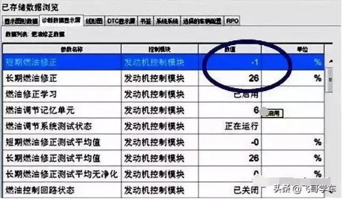 发动机燃油修正数据发现“长期燃油修正数据为26% ”。