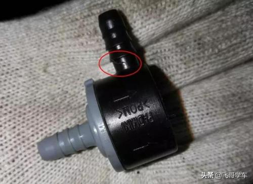 11、这时发现在进气歧管下方的单向阀外表有些异常且有一条小裂纹,检查此单向阀安装在进气歧管内置的真空储能罐上,此真空储能罐专门为改变进气歧管长度的真空阀提供真空源。更换进气歧管后的真空单向阀后,故障现象消失。