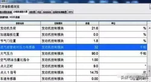 8、检查怠速时的进气绝对压力传感器数据为32kPa。