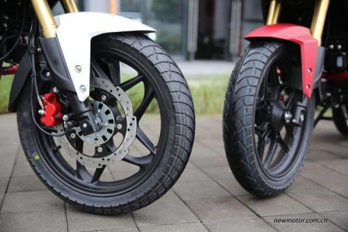 轮胎规格为前110/70-17,后140/70-17,铝合金轮毂配真空胎。