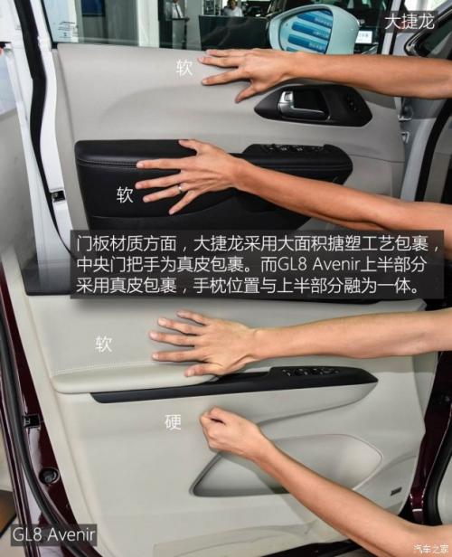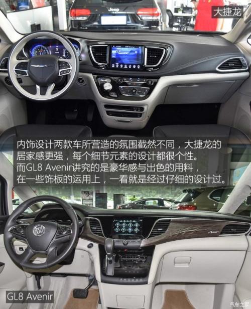 GL8 Avenir对于内饰的用料更为考究,面板摸起来手感更舒服,毕竟作为GL8车系的旗舰定制产品,还是需要有一些自己的特色的。但价位更高的大捷龙,内饰质感也代表了克莱斯勒品牌对于美系豪华的诠释,从用料质感上来说没差到哪去。