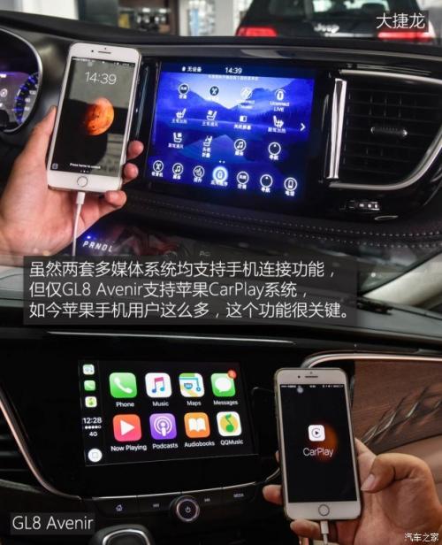 多媒体系统方面,GL8 Avenir配备的是一块8英寸显示屏,大捷龙则是8.4英寸,相差不大。清晰度与操作流畅度两者都做的不错。有一点值得注意,GL8 Avenir的多媒体系统支持CarPlay功能,但大捷龙不支持,只能匹配克莱斯勒专用App,这一点上不够与时俱进。