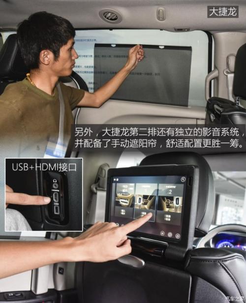 第二排座椅的设计与配置情况,两款车走了不同的风格。GL8 Avenir仍旧主打豪华,且对于第二排乘客的乘坐感受非常照顾,第二排座椅不仅配备电动调节、座椅通风、座椅加热等,甚至包括座椅按摩、电动调节腿托等功能都应有尽有,基本都可以满足商务用途了。而大捷龙的风格则是走向了居家范儿,第二排独立的多媒体系统以及可拆卸座椅,则是更注重家庭使用的需求。