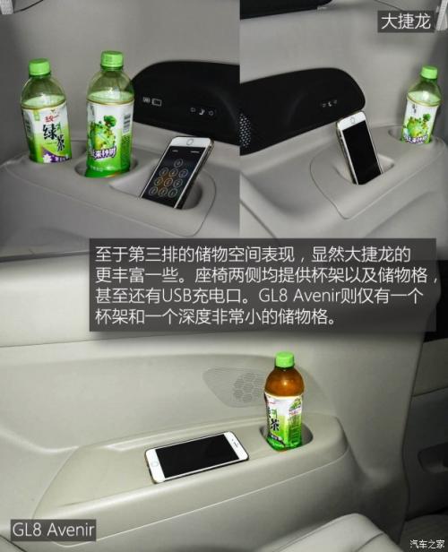 最后看第三排,其实前面对于GL8 Avenir第三排乘客的照顾我们基本也可以猜出个结果,从上图的储物表现来看,大捷龙比GL8 Avenir强多了。储物空间对比之后,我们最后再来看看两款车的后备厢空间表现。