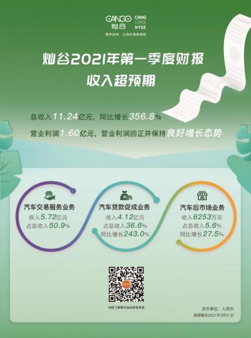 北京时间6月1日,汽车交易服务平台灿谷公布2021年第一季度未经审计业绩。财报显示,得益于在车交易服务业务、汽车后市场服务和助贷业务的持续深耕,灿谷2021年第一季度整体业绩表现超预期。公司当季总收入人民币11.24亿元,较去年同期的人民币2.46亿元大涨356.8%,公司营运利润达人民币1.60亿元。