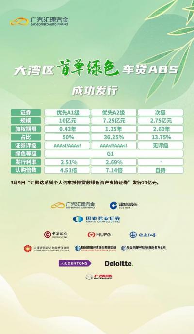 此外,广汽汇理还在今年3月份发行了粤港澳大湾区首单绿色车贷ABS——汇聚达2023年第一期个人汽车抵押贷款绿色资产支持证券,金额达20亿元,凭借优质资产获得了投资人的广泛关注及热烈追捧。
