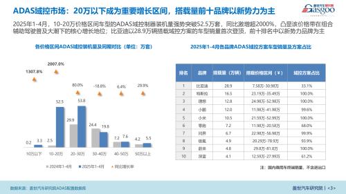 总体来看,ADAS域控制器已逐步走出导入期,迈入快速增长阶段。随着技术进步带来的成本下降,预计2025年下半年将迎来新一轮配置热潮,进一步推动L2++功能向20万元级市场下沉,全面加快汽车产业智能化转型进程。
