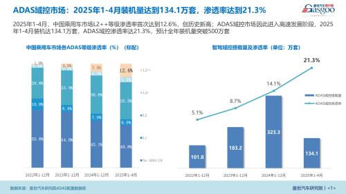 根据盖世汽车研究院ADAS配置数据库的分析,2025年1月至4月期间,国内ADAS域控市场实现快速增长,装机量达134.1万套,市场渗透率提升至21.3%。