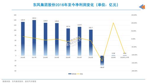 自主品牌尚未形成盈利规模效应,加上合资板块销量与盈利双双承压,作为乘用车上市主体的东风集团股份盈利持续萎缩。2022年起,其净利润出现断崖式下跌,从102亿元锐减至2024年的5800万元,2023年甚至亏损38.9亿元。