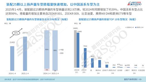 在新能源乘用车市场,座舱声学配置呈现出明显的高端化特征。过去,配备大量扬声器的豪华音响系统多见于价格高昂的进口或豪华车型,而如今,这一配置正加速向国产新能源车型普及。根据最新数据显示,2025年1-4月,搭载25颗及以上扬声器的车型累计搭载量达到29,773辆,同比增长近39%。
