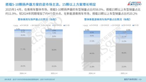 然而,15颗以上扬声器方案的增长势头也不容忽视。在整体乘用车市场中,2025年1月至4月搭载15颗以上扬声器的车型销量占比达到了约11.9%,比2024年同期增长了4个百分点。在新能源乘用车市场中,这一比例达到了20.2%。15颗以上扬声器方案的增长反映了市场需求的升级和消费者偏好的转变。