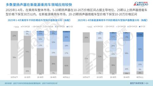 然而,在新能源乘用车细分市场中,情况有所不同:20至25颗扬声器的配置已下探至10-20万元价格区间,显示出高端音响系统正在逐渐向中端市场渗透。这意味着,随着技术进步和市场需求的变化,更多中端新能源车型也开始配备更为先进的音响系统,以提升驾乘体验。