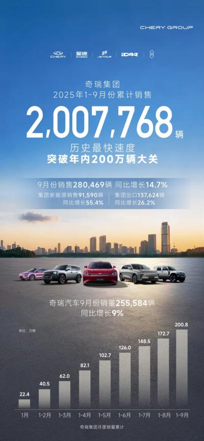 金秋十月,奇瑞集团如期交出了一份令人瞩目的成绩单。最新数据显示,2025年前三季度,集团累计销售汽车突破200万辆大关,实现了里程碑式的“五大历史突破”。