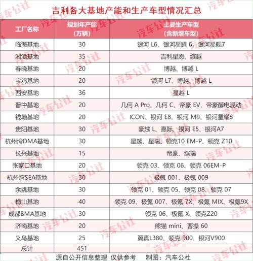 据《汽车公社》统计,目前吉利汽车在全国范围内主要有16大基地,比较集中的是浙江,另外湖南、贵阳、四川、西安、河北、山西、山东等地都有基地布局,实际规划产能超过450万辆。
