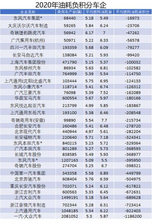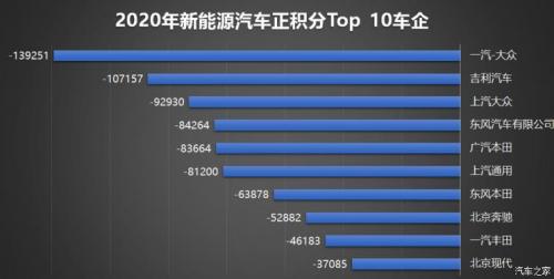 在新能源汽车负积分榜上,前10名大部分为合资品牌,一汽-大众、上汽通用、上汽大众等榜上有名。同时,这几家车企的平均燃料消耗量负积分情况更为严重,其中一汽-大众油耗负积分近120万分。