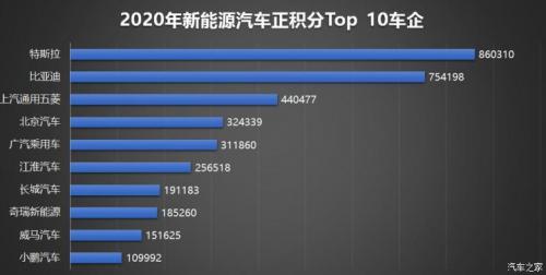 2020年统计在内的117家境内乘用车生产企业中,有67家企业新能源汽车积分为正值,20家新能源汽车积分为0,30家新能源汽车积分为负值。其中,新能源汽车正积分超10万分的企业有11家,特斯拉以超过86万分新能源汽车正积分的成绩居首,比亚迪(包括比亚迪汽车和比亚迪工业)紧随其后,为75万分,上汽通用五菱位列第三,新能源正积分达44万分。