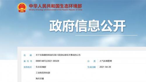 近日,生态环境部、工业和信息化部、海关总署发布关于实施重型柴油车国六排放标准有关事宜的公告。宣布自2021年7月1日起,全国范围全面实施重型柴油车国六排放标准。具体内容如下: