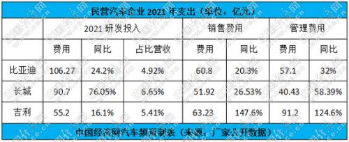 在销售费用方面,2021年,比亚迪、吉利汽车、长城汽车分别支出60.8亿元、63.23亿元、51.92亿元;同比分别增长20.3%、147.6%、26.53%。在管理费用方面,2021年,比亚迪、吉利汽车、长城汽车分别支出57.1亿元、91.2亿元、40.43亿元;同比分别增长32%、124.6%、58.39%。