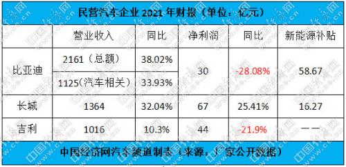 日前,作为上市公司的多家汽车企业先后发布2021年财报。引人注目的是,比亚迪(600609.SH)、长城汽车(601633.SH,02333.HK)和吉利汽车(0175.HK)三家民营汽车企业的营业收入均超千亿元,成为业界关注的焦点。