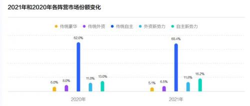 按照新能源汽车市场参与者的属性划分,可分为传统豪华品牌、传统外资品牌、传统自主品牌、外资新势力品牌和自主新势力品牌“五大阵营” 。2021年自主新势力品牌扩张明显,对其他阵营的市场份额均有不同程度蚕食,用户的接受度和认可度进一步提升。