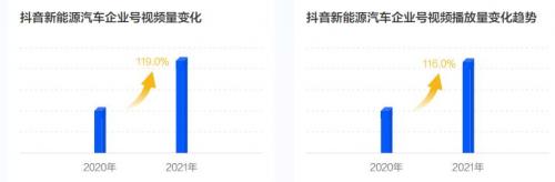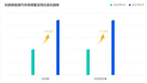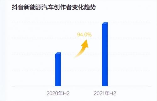 巨量算数数据显示,抖音汽车内容吸引越来越多的内容创作者加入,其中2021年H2较2020年H2,新能源汽车创作者同比增长近1倍,规模进一步扩张。