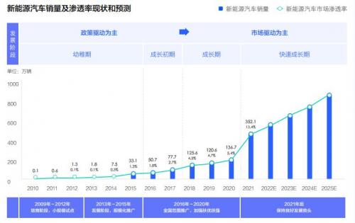 随着新能源汽车市场由政策推动向市场驱动转型,产业也经历了萌芽期及初步探索期,进入快速成长期。并且,伴随科技力量的加持,品牌、车型、区域等细分领域也在不断调整,行业格局初步形成,产业在不断创新中实现跨越和变革。