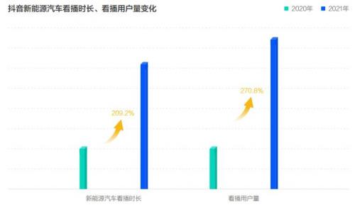 从用户看播角度来看,2021年新能源汽车直播的用户看播时长、看播用户量同比分别增长209%、270%,用户的看播兴趣进一步增强,直播时关注主播的粉丝数量同比也有近3倍的增长。