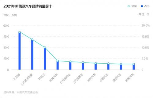 根据中国流通协会数据统计,2021年我国有销量的新能源汽车企业超过100家,前20%的品牌销量合计258万辆,占整体新能源汽车销量的84%,市场集中度高,符合“二八定律”。