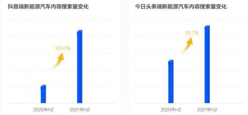 用户的主动搜索兴趣也在升温。巨量算数数据显示,在抖音端,新能源汽车内容搜索量较上年同期增长约329%,今日头条端新能源汽车内容搜索量较上年同期也有超过80%的增长,用户对新能源汽车的兴趣进一步提升。